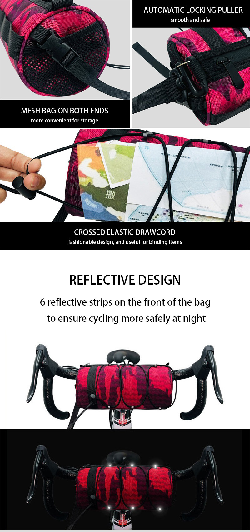 Feature:small size but large capacity,could be a shoulder bag,six reflective strips ensure safety,storage mesh bag at ends,crossed elastic drawcord for bundle purpose,non-slip and durable