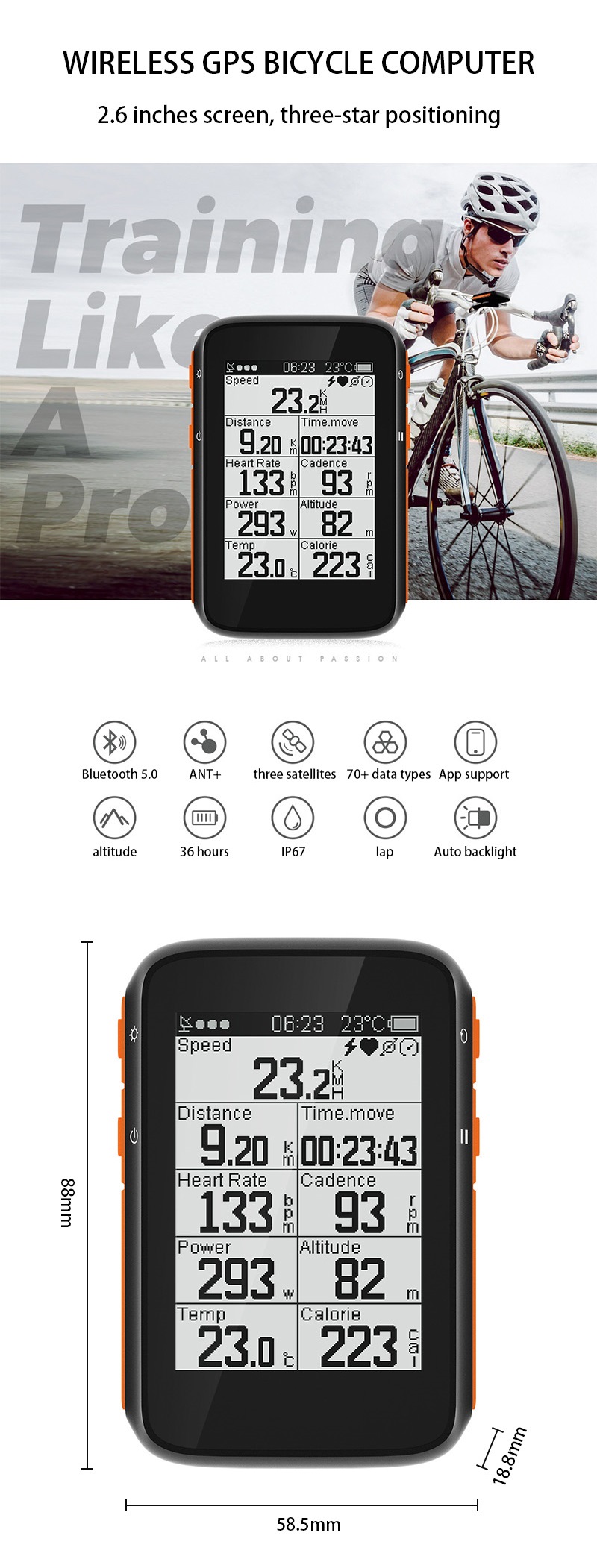 Feature:large LCD display,accurate GPS positioning,ANT+ & bluetooth 5.0,APP support,multidata display and custom setting,multi-language,IP67 water-resistant