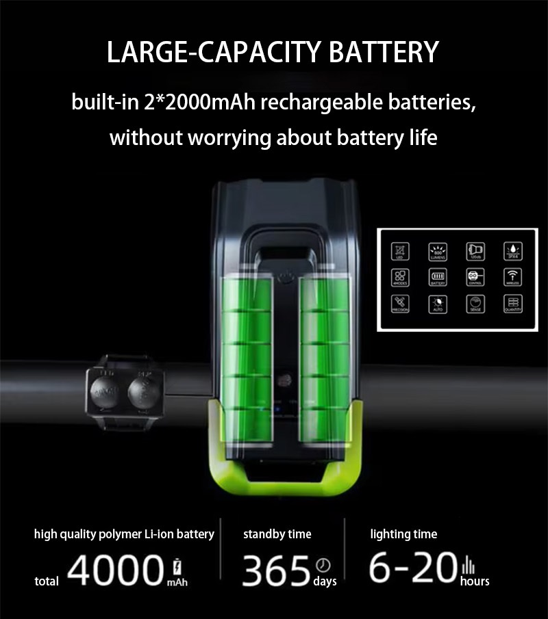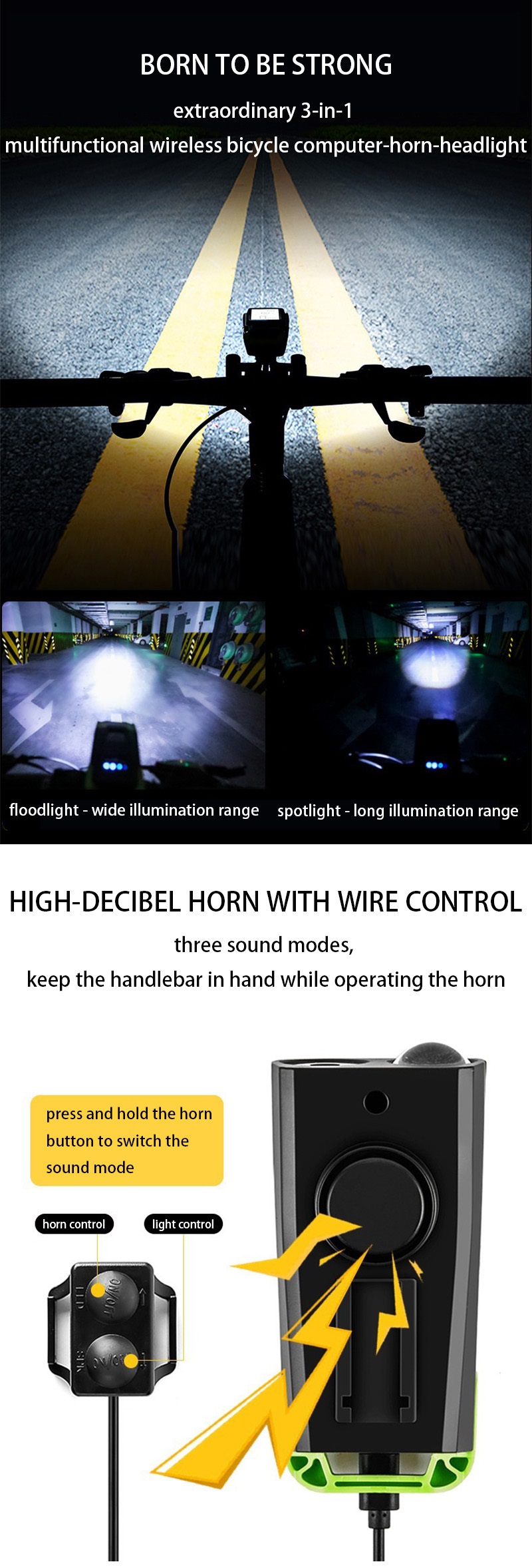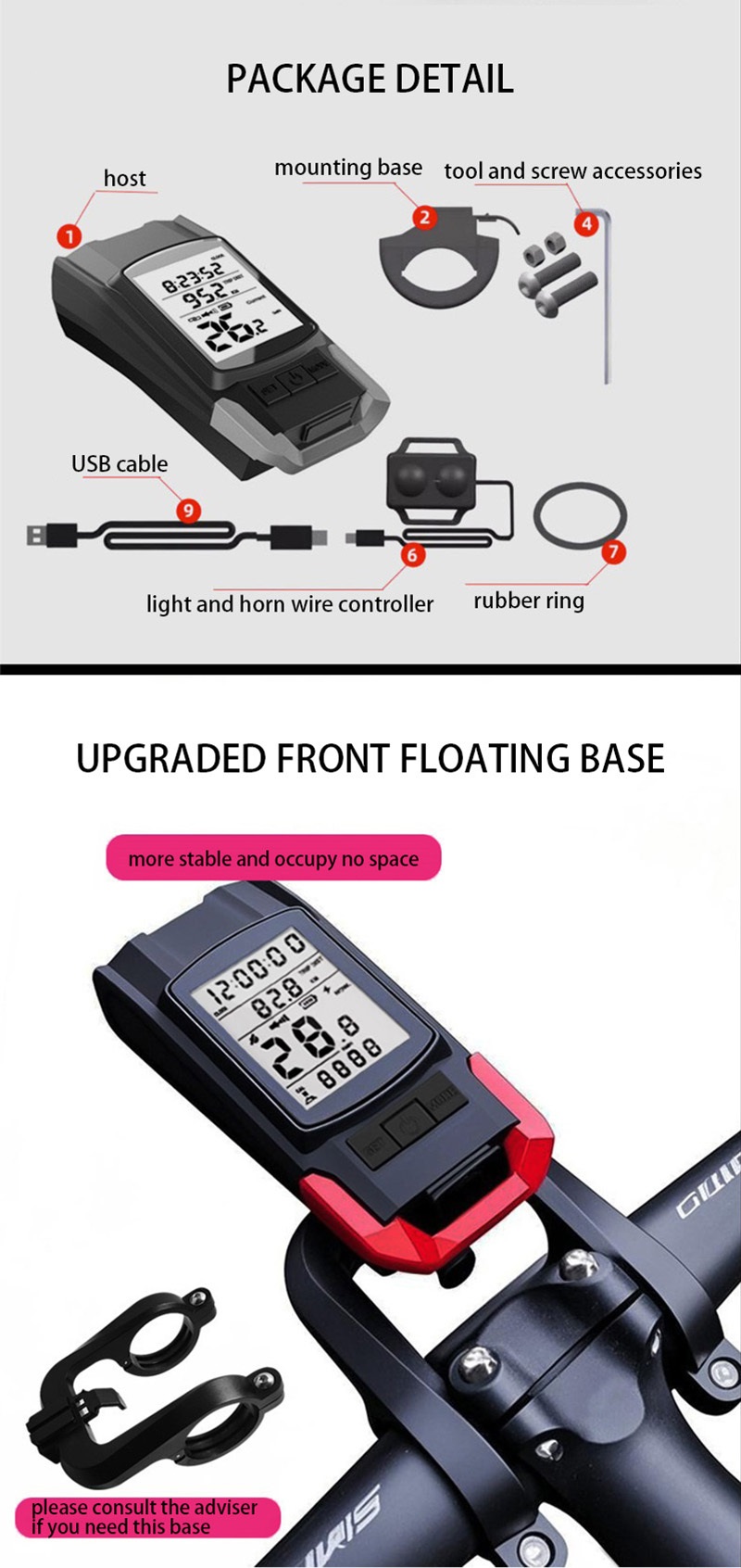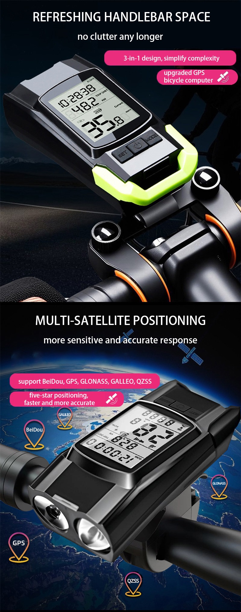Feature:bicycle computer-headlight-horn in one,large LED display,GPS positioning data,highlighted dual lights,high decibel speaker,satellite timing,IPX4 water-resistant