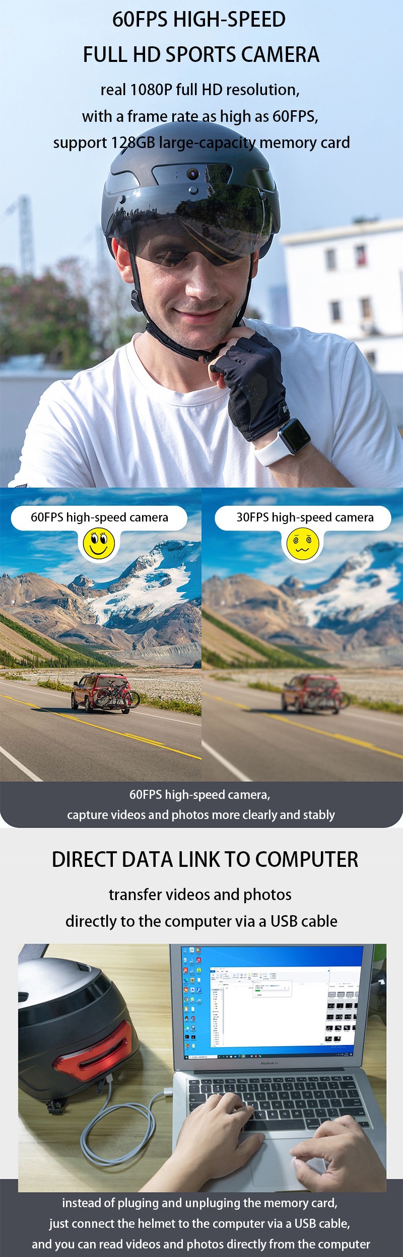 Feature:4-hole,unibody design,adustable head circumference,detachable goggles,IPX5 water-resistant,dual-antenna bluetooth 5.2,1080P/60FPS HD camera,remote control turn signal warning lights,automatic brake sensor,earmuffs option